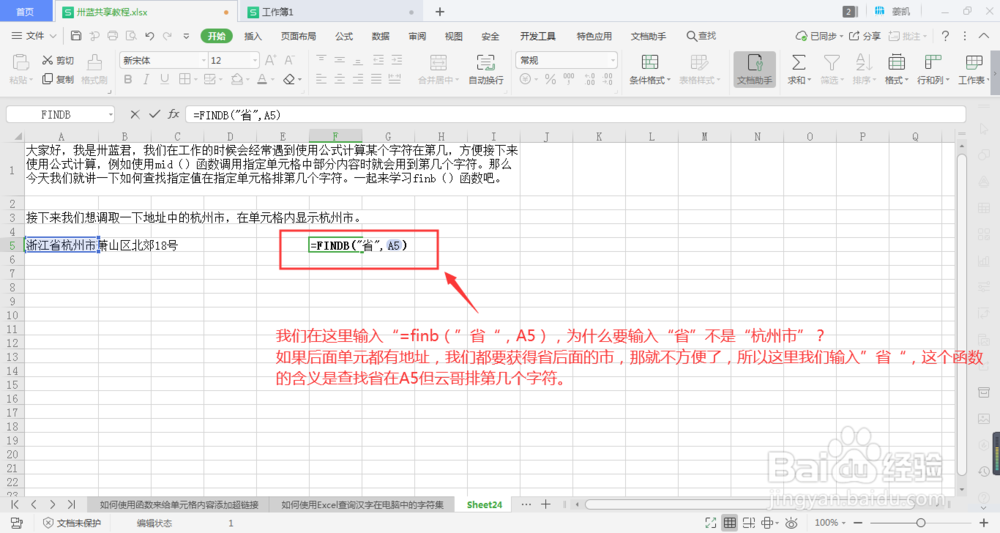 3/6我们在后面的一个空单元格先输入一个公式”=finb(“省“,A5)”,表示提取省这个字在这穿字符中排第几个字节。为什么要查这个,看图片解释。这里就用到我们前面所述的查找某个字符在第几个字节了。