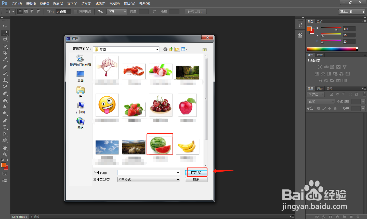 首先在电脑中打开PS软件,使用“Ctrl+O”组合键,将需要的图片素材导入进来。
