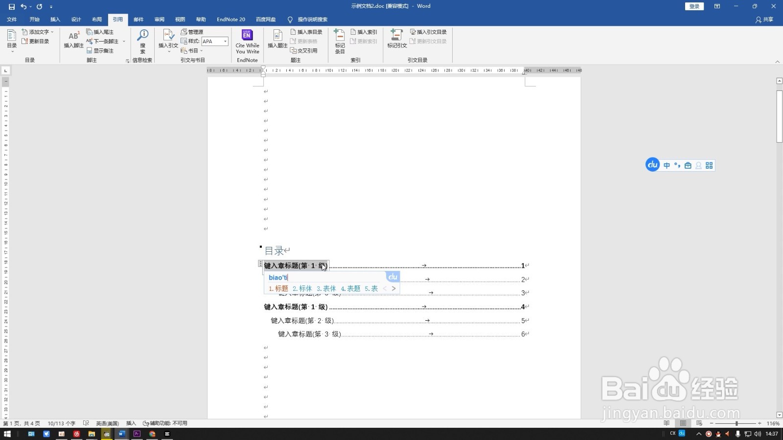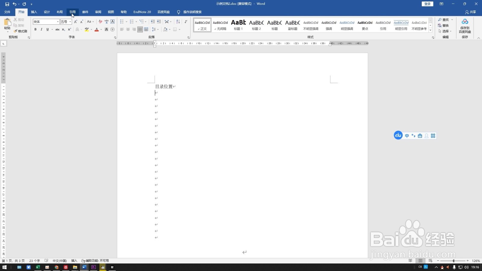 移动光标到要生成目录的位置,点击菜单中的引用选项。