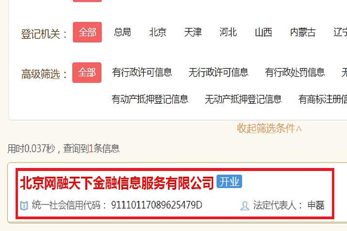 三、在搜索的结果中找到“北京网融天下金融信息服务有限公司”,点击进入;