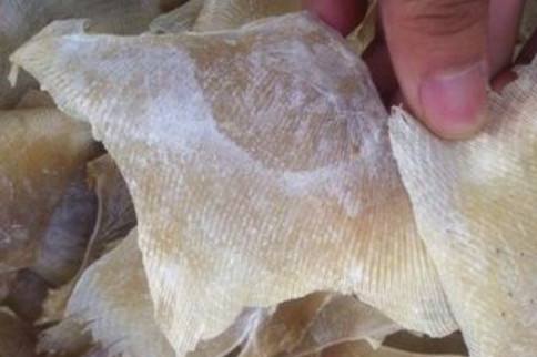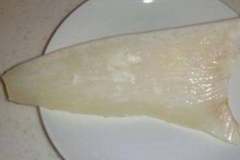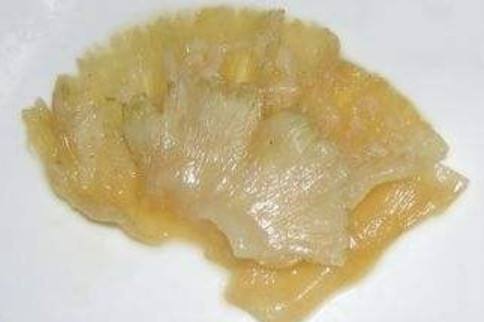 3、然后,取出冷却后的鱼翅,用清水浸洗以清除鱼翅中的胶质和泥沙,并再次冲洗干净。
