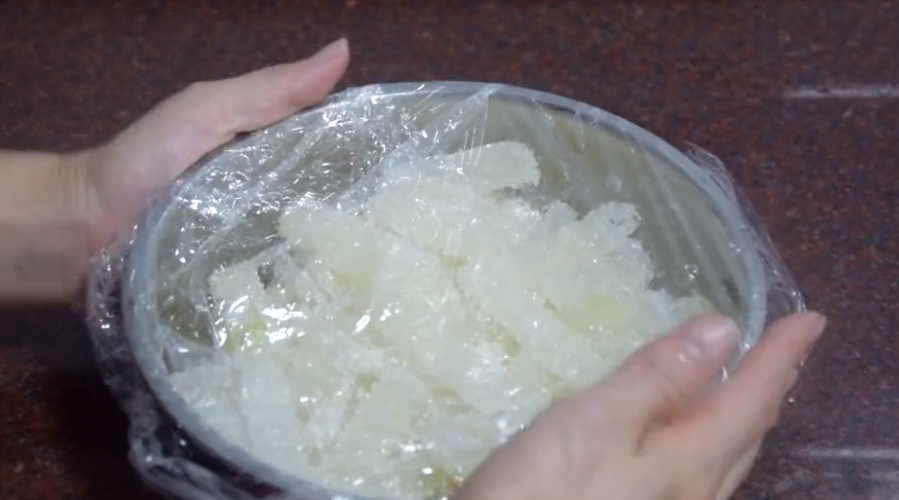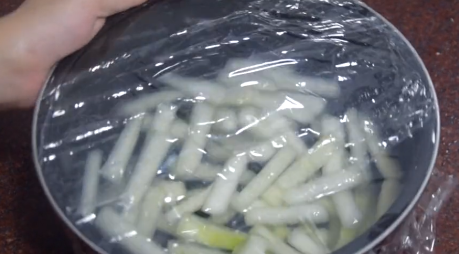 4、在容器中倒入刚好淹没冬瓜条的水,再盖上保鲜膜。