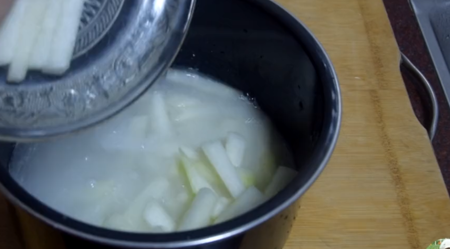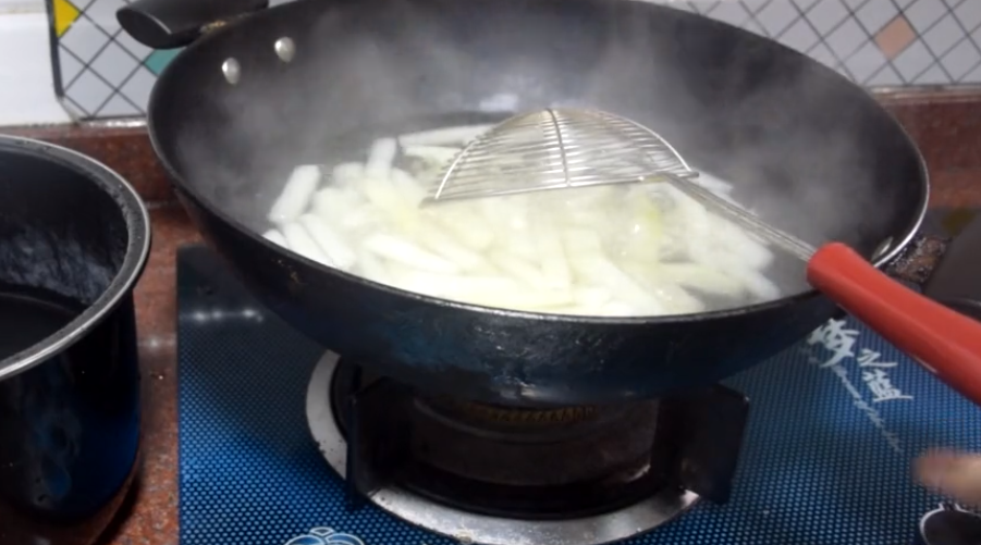 7、提前将水烧开,将冬瓜条倒入锅内焯5分钟。