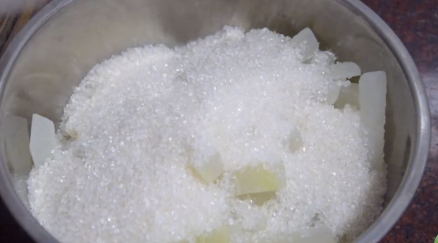 糖与冬瓜是一斤冬瓜放入400克糖。石灰注意用食用级生石灰,浓度2%,即1千克水混入20克的石灰。上层清水富含果胶酸钙,作用是防止瓜肉煮软,成品可以更脆爽。