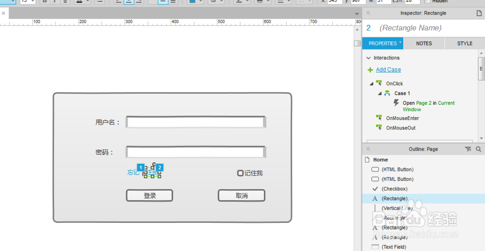 5/6第五步,给”忘记“和”注册“添加链接,一个链接到”Page 1“,另一个链接到”Page 2“,进行页面跳转,如下图所示: