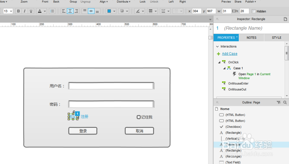3/6第三步,再拖出两个“Link Button”、一个“Vertical Line”、一个”Checkbox“和两个”HTML Button“,并修改其显示的内容,即为登录和取消,如下图所示: