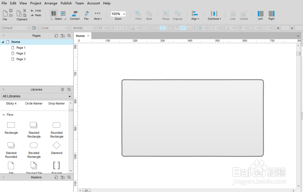 第一步,打开Axure RP 8软件,找到“Rounded Rectangle”,拖出一个到Home页面,调整原件的高度和宽度,如下图所示: