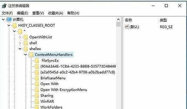 3、展开注册表项HKEY_CLASSES_ROOT\*hellex\ContextMenuHandlers,删除可疑项;