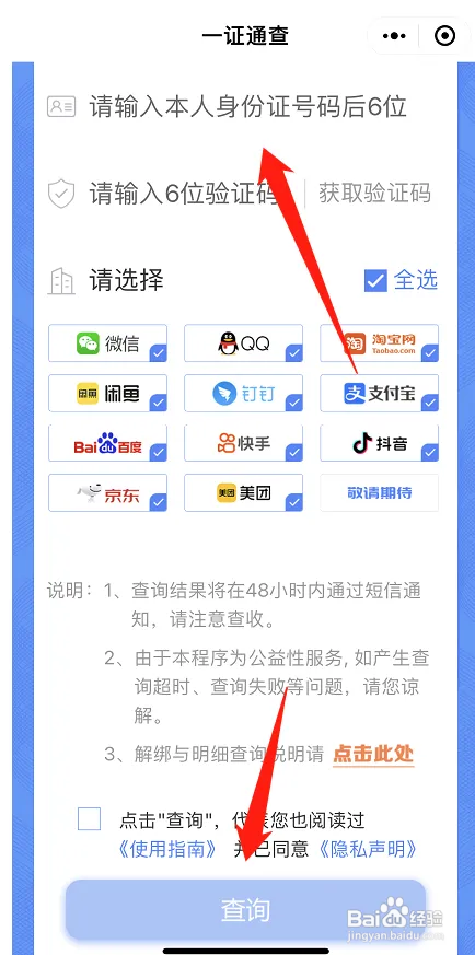 4/4之后进入互联网账号查询首页面后,填写手机号码、身份证号码后六位和验证码,即可进行查询。