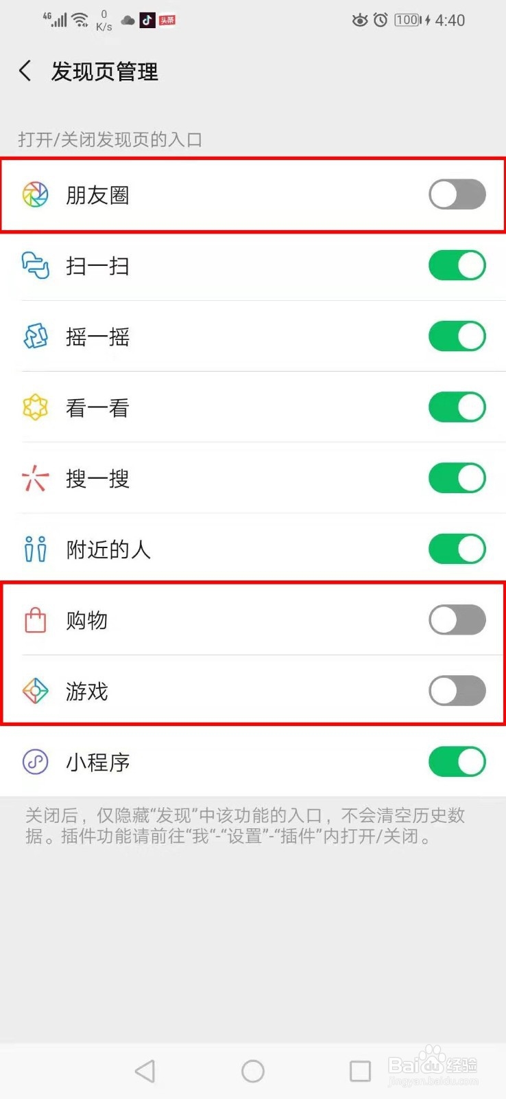 5/6比如我想关闭朋友圈、购物、游戏等发现页,点击这些选项右侧按钮即可。