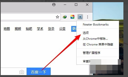 5、这时就会把该应用添加到Chrome浏览器的插件栏了,我们右键点击该插件,在弹出菜单中选择“选项”菜单项。