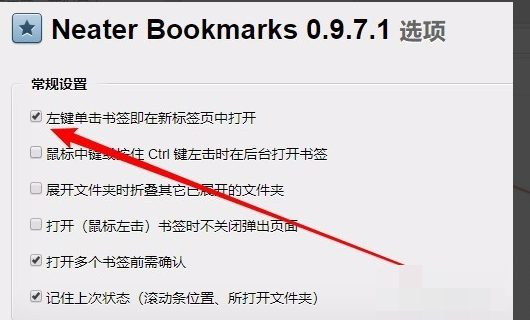 6、在打开的NeaterBookmarks选项页面中,我们选中“左键单击书签即在新标签页中打开”前面的复选框,最后点击确定按钮即可。这样我们以后再点击书签中的网址时就会用新标签页打开了。