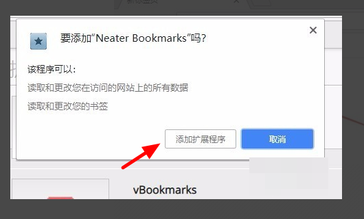 4、这时就会弹出一个“要添加NeaterBookmarks”的提示,点击“添加扩展程序”按钮。