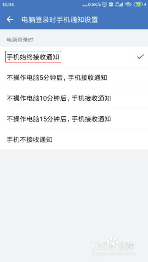 6/6此时,点击最上面的“手机始终接收通知”,发现右边是勾选按钮,说明电脑登录时手机始终接收通知设置好了。