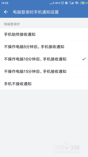 5/6点击进入后,会发现默认是不操作电脑10分钟后,手机才接收通知。