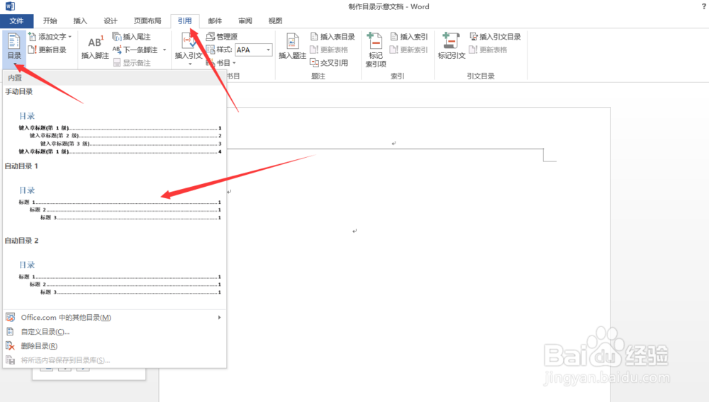 将鼠标点击到制作目录空白页的首位置,选择上方标题栏的引用,点击目录,选择自动目录一,就可以制作出目录了。