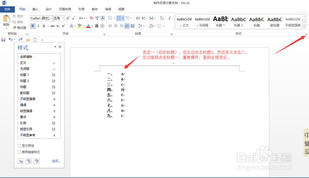 选择标题栏右下角的样式,弹出一个对话框,然后左边先选定你要制作目录的标题,再右边选择标题1,以此类推,多次重复操作,知道所有标题选定。