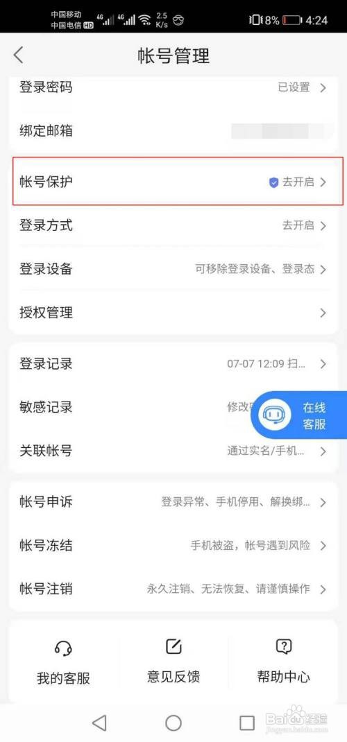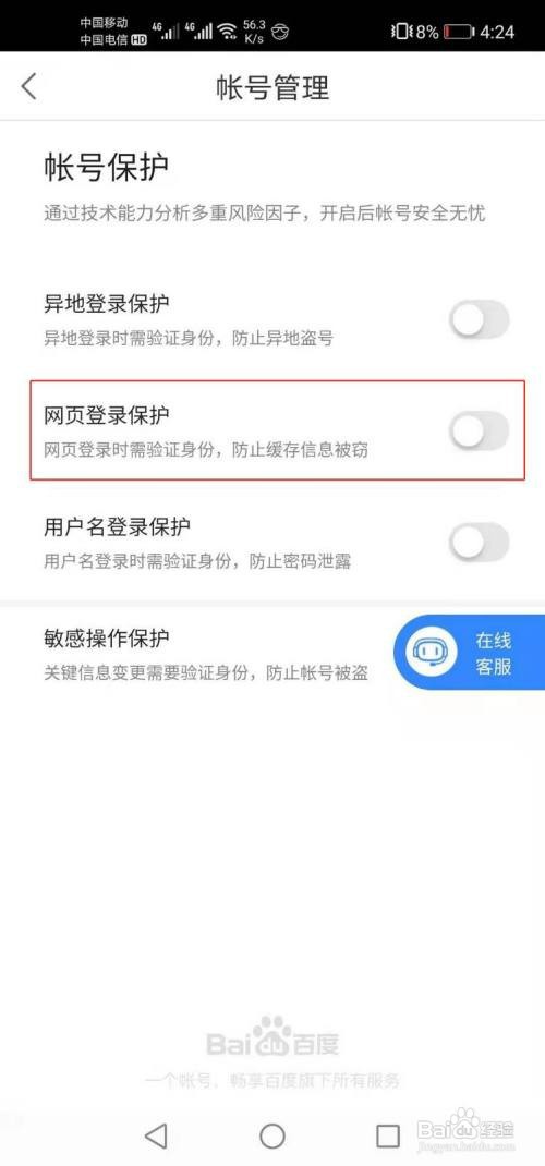 5/5如图所示,进入到账号管理页面,将网页登录保护按钮打开即可。