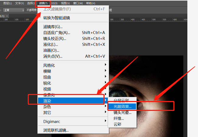 4、在菜单栏中选择“滤镜-渲染-光照效果”,添加光照效果。