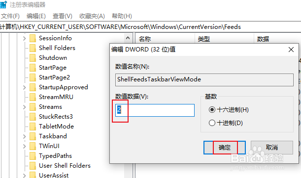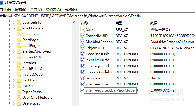3/4在右侧,双击ShellFeedsTaskbarViewMode以修改值数据。