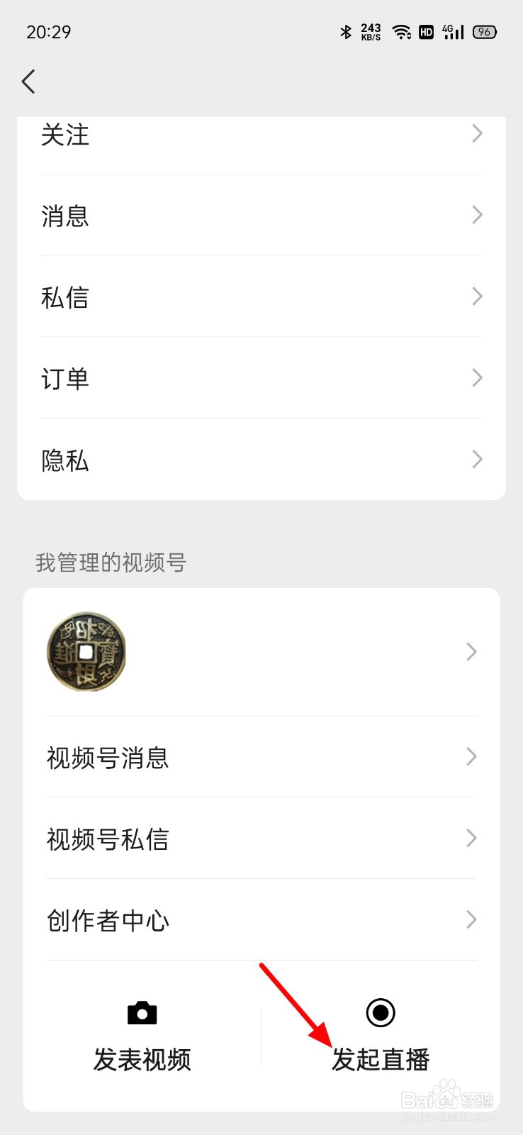 3/8在菜单界面,点击【发起直播】。