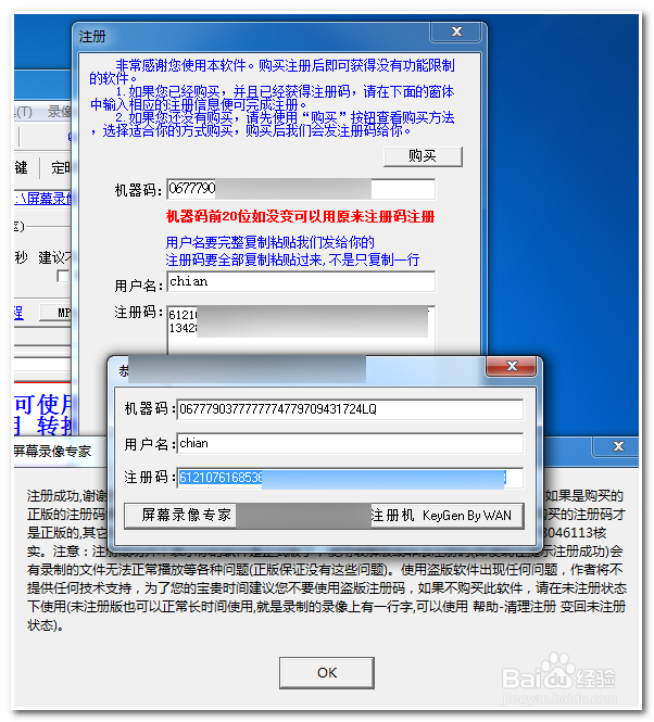 3/3把机器码和用户名都复制到算法注册机里面算出注册码,(用户名可以随便填写,但是要和屏幕录像专家用户名保持一致)下图就是注册成功的样子