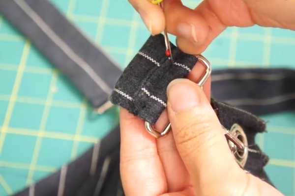 3、接着用大头针固定住要保留的带子部分,把多余的用剪刀剪掉。