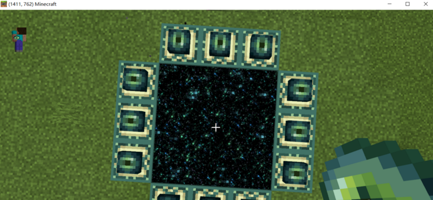 3、像这样顺时针的摆放完四面的末地传送门方块。(也可以逆时针,在摆放的途中要全程的站在方块上,不要下来。)
