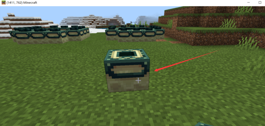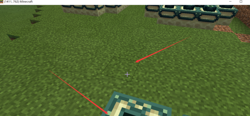 2、后我们站在垫高的方块上,在方块前一格的位置放置末地传送门方块。(箭头指的位置)