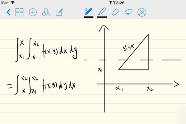 6、然后不断移动这条平行线,先写出y的上下限x2和x1,然后根据平行线,写出x的上下限x2,x。如下图所示。