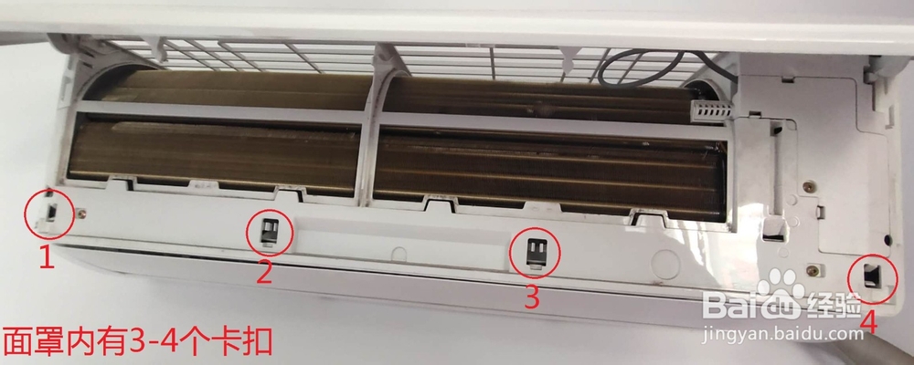 踩梯子视线与空调挂机平齐,先从挂机左右下角拉起面板外盖,内部一般3-4个卡扣,拉起时稍微用力向上即可打开挂机面板盖