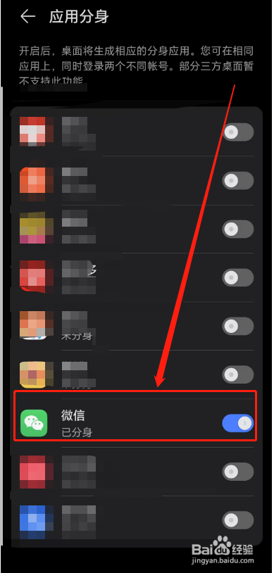 4/4在页面中找到“微信”图标,将后方对应的按钮调至开启状态,即可完成在荣耀80手机上登录两个微信了。