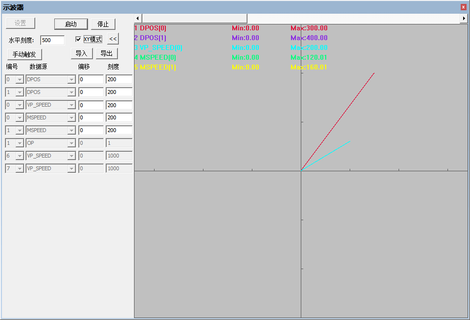 闭合X1触点,产生一个上升沿脉冲,M0导通并自锁,同时触发示波器采样指令和MOVE直线插补运动指令执行,得出波形如下图,X2触点用于快速停止轴运动。