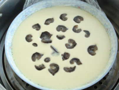 8、蛋羹蒸5分钟后揭开保鲜膜,小心的把海参片摆入,继续再蒸3分钟。