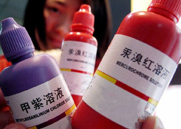 红药水,即红汞,常用的红药水是2%汞溴红溶液;常用的紫药水是1%至2%龙胆紫(甲紫)稀释溶液。