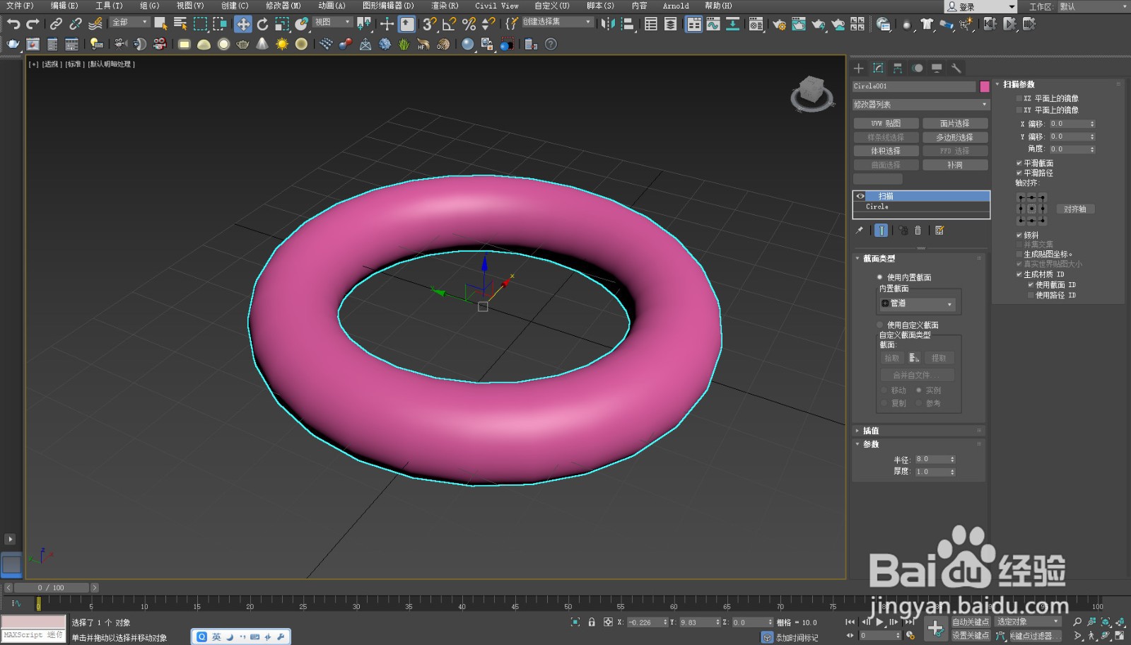 2,建模窗口中绘制出圆形,添加扫描命令。