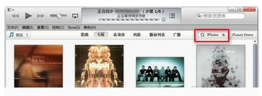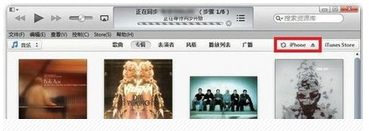 4.当你把想要放进移动设备的文件都放入资料库后,点击iTunes界面右上角的“当前连接的设备”按钮。(这里以iPhone为测试设备)