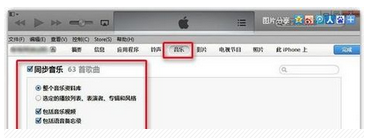 5.接着,点击如下图中的【音乐】标签选项,将【同步音乐】前面的勾打上,选中【整个音乐资料库】然后点击右下角的【应用】按钮,再点击出现的【同步】按钮,就开始同步音乐了。