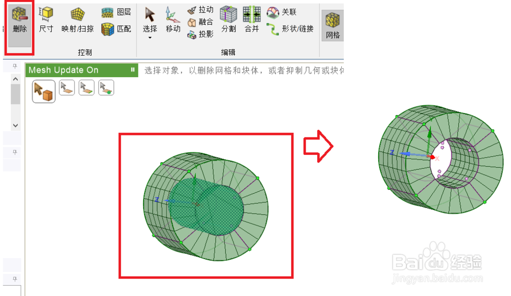 4/6将端面的边框线与模型的端面圆“关联“-点击“关联“-选择两端面边框线,分别与各自端面关联;此时得到的网格,中间孔是填平的;