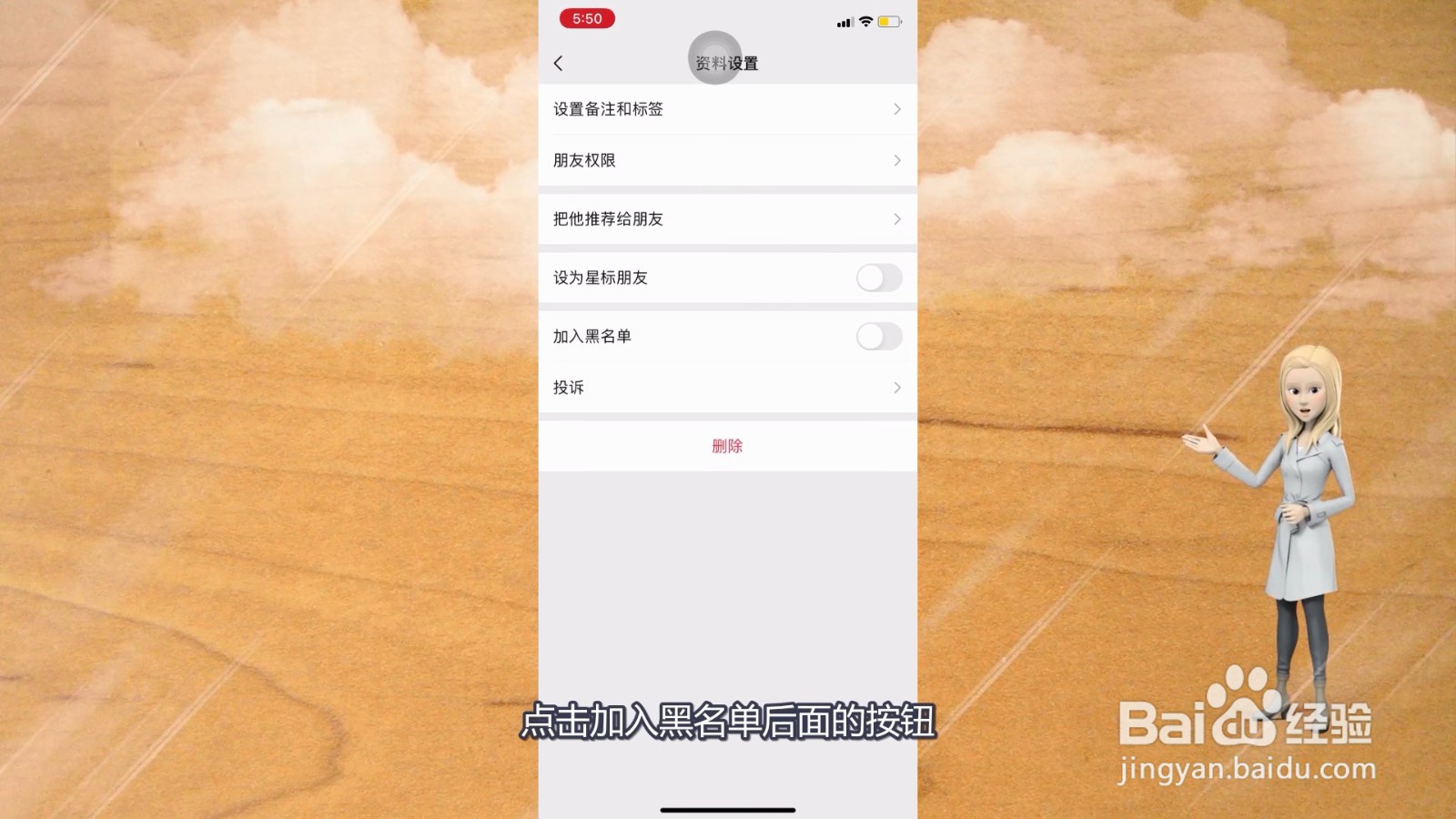 5/6打开资料设置后,点击加入黑名单后面的按钮。