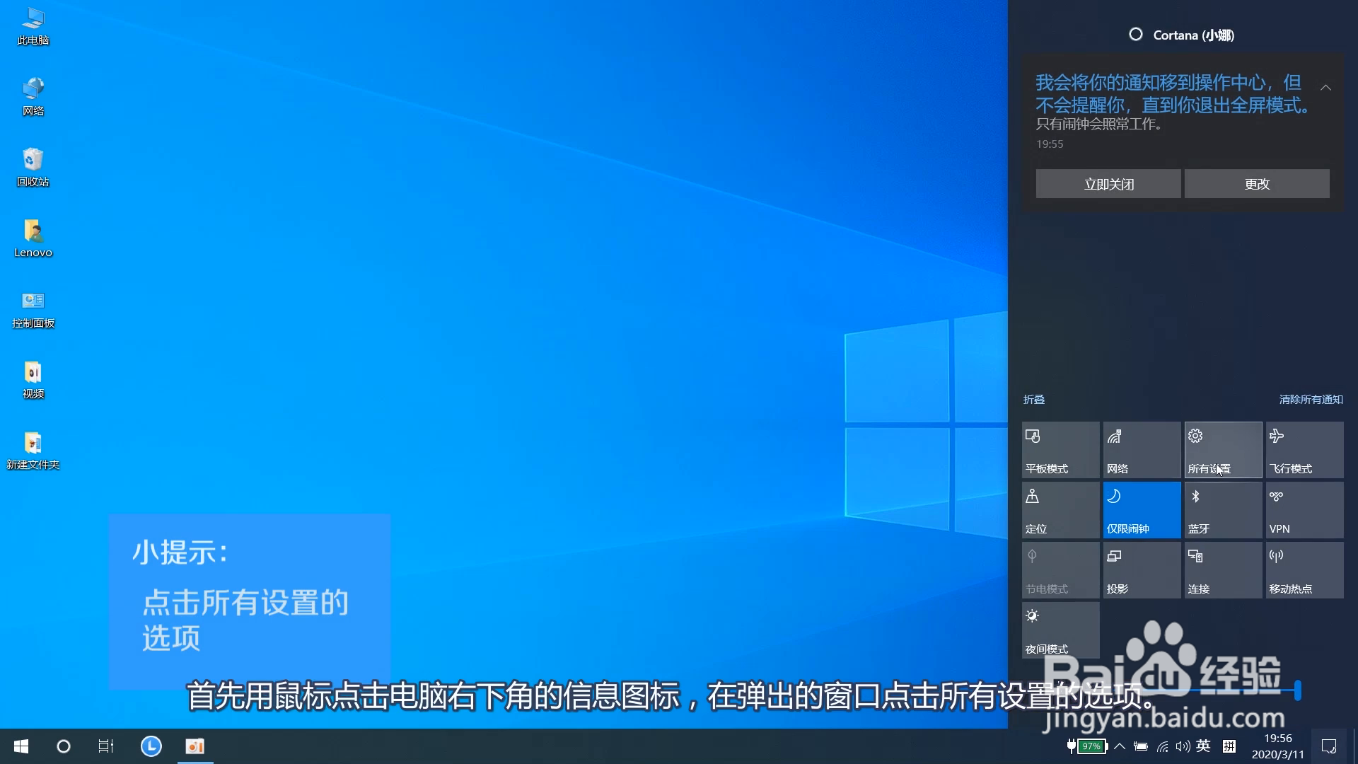 总结1.点击右下角信息图标,点击所有设置选项。