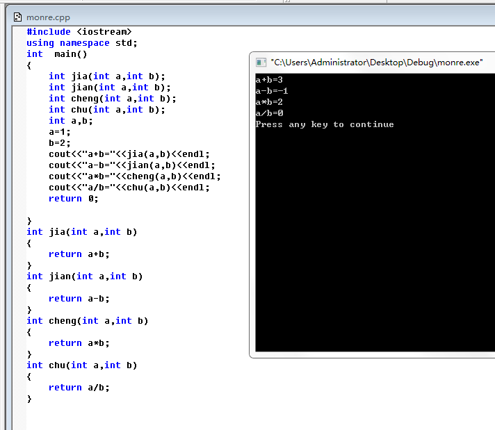 c++题目 编写四个带有两个整型参数并返回整型值的函数,分别输出其两个参数的和、差、积、商。