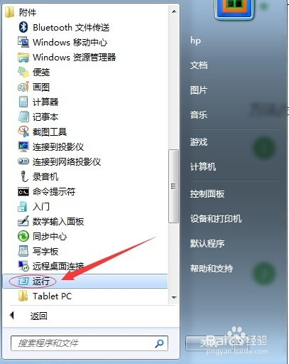 打开【开始】菜单,在【附件】选项中,找到【运行】选项,如图