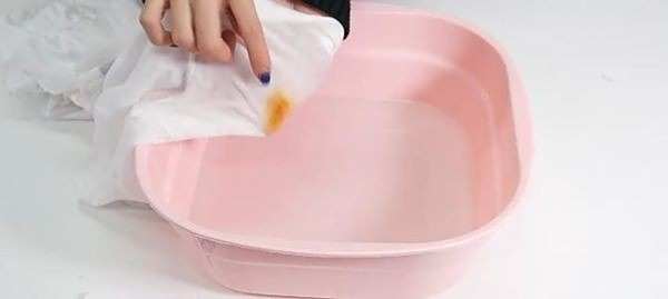 2、然后将衣服放入水盆中倒入热水浸泡。