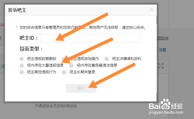 4/4最后输入吧主ID,选择投诉原因,点击提交即可。