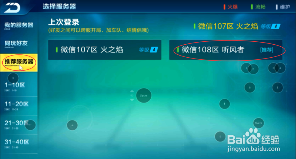 3/9这时,弹出登录界面,此处默认会推荐流畅度好的服务器,你可以选择推荐也可以选择其他服务器。再有就是还可以选择与好友同在一个服务器区,这样互动性更高。