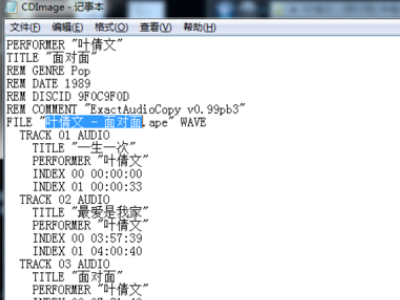 4、这时用记事本格式打开CUE文件后,发现其实这个ape文件的命名有问题,直接复制蓝底文件,将ape文件重新命名,保存就可以了,这时打开就不会在出错了,可以尽情享受音乐了。
