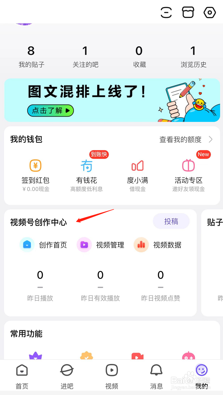 首先我们在应用商城去下载一个【百度贴吧】app,用自己的百度账号登录一下,进入app首页我们可以看到有个【视频号创作中心】,我们点击它进入,如下图所示