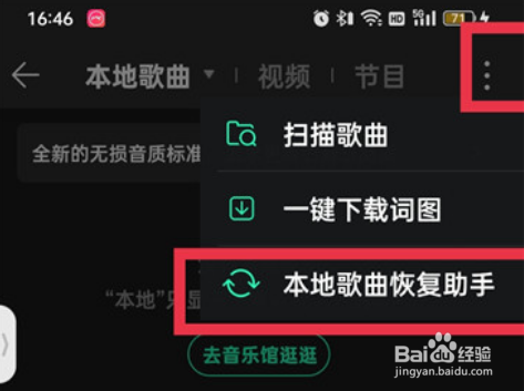2/3在弹出的页面,然后在本地的页面中点右上角的【三点】图标,然后在弹出的选项中点击【本地歌曲恢复助手】;