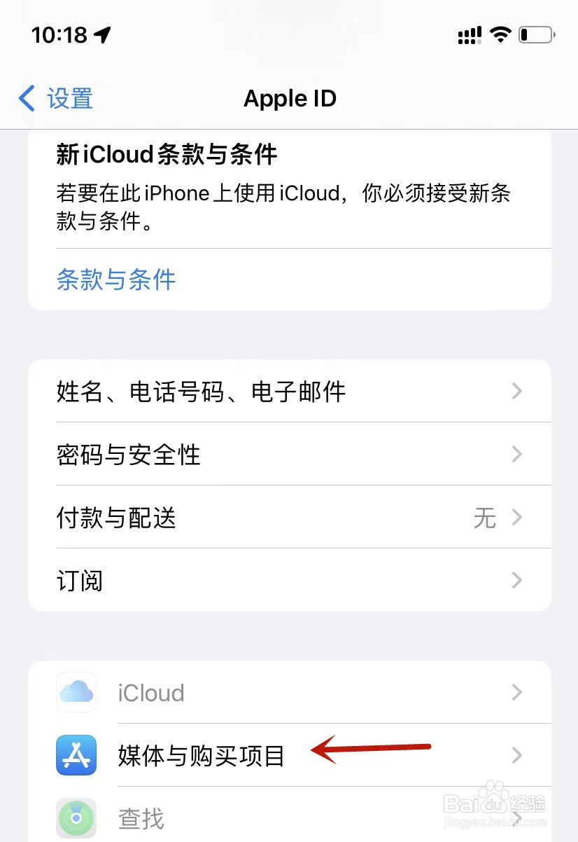 在手机设置中,点击Apple ID、iCloud、媒体与购买项目。